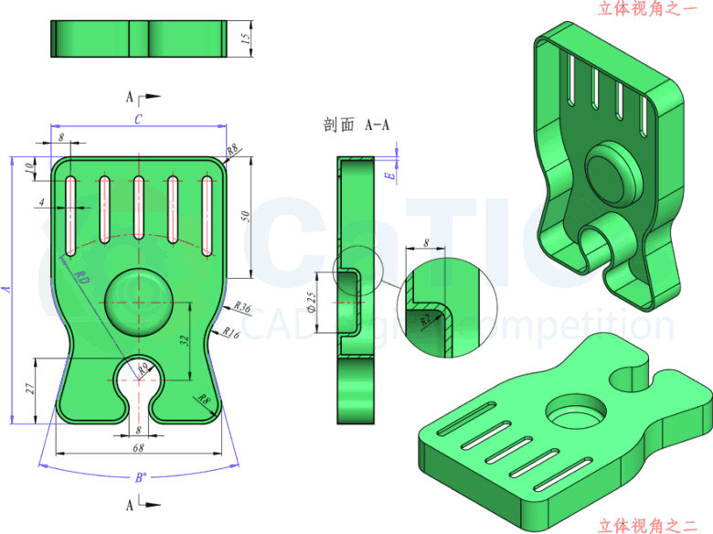 参照图构建模型,注意其中的对称、重合、等距、同心等约束关系。零件壁厚均为E。