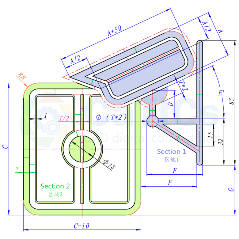 题目:参照下图绘制图形,注意其中的对称、相切、等距等几何关系。图中同色短线长度相等、同色圆弧等半径。