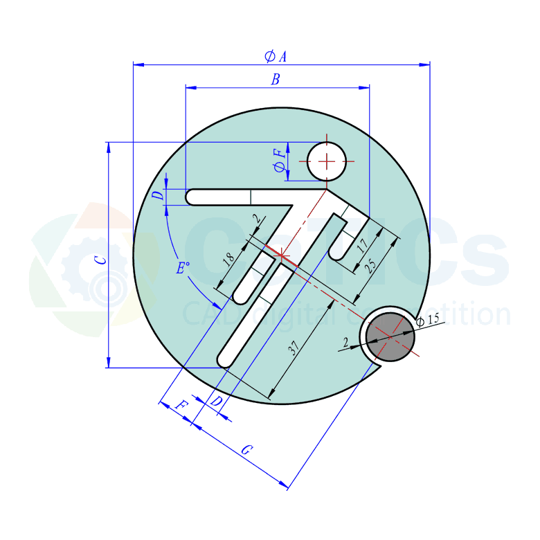 题目:请参照图绘制几何轮廓,注意其中的平行、水平、相切、同心、竖直等几何关系。其中大圆圆心和红色直线的中点重合,五段绿色直线的长度都是D。
