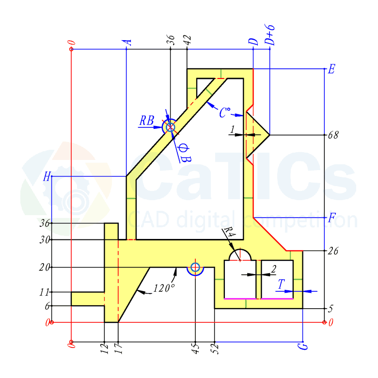 注意其中的水平、竖直、垂直、共线等几何约束。图右侧的红色边线之间的角度均为135度。图中同色线条的尺寸(长度或半径)相同,其中绿色短线长度均为T。