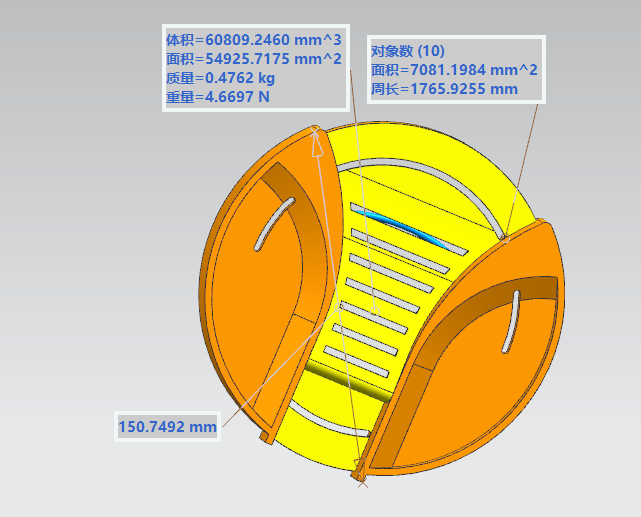 体积 = 60807.113  mm^3  距离: 150.75mm 面积: 7081.2 mm^2
